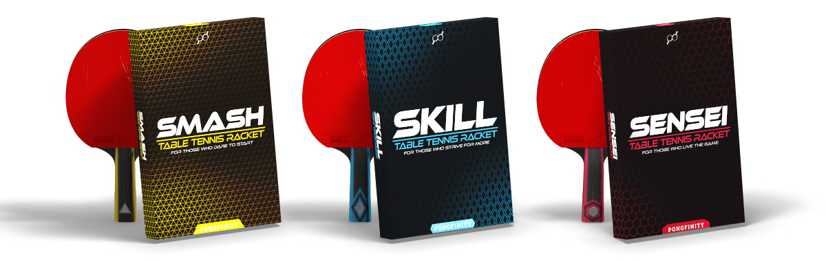 Together with Pongfinity, I developed the full concept and design system for a three-tier racket line, covering product structure, differentiation, and all visual components.